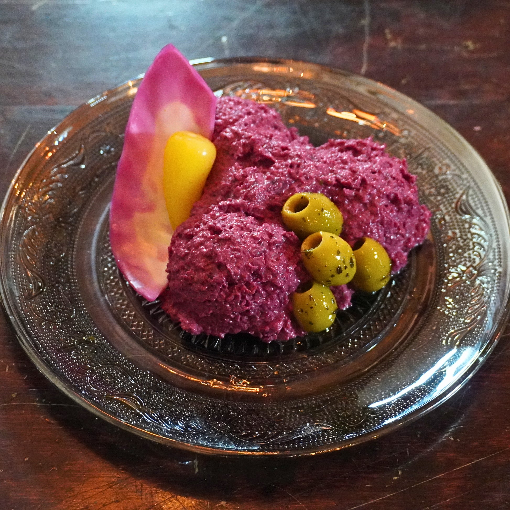 Dip van gekookte rode bietjes met tahin en knoflook